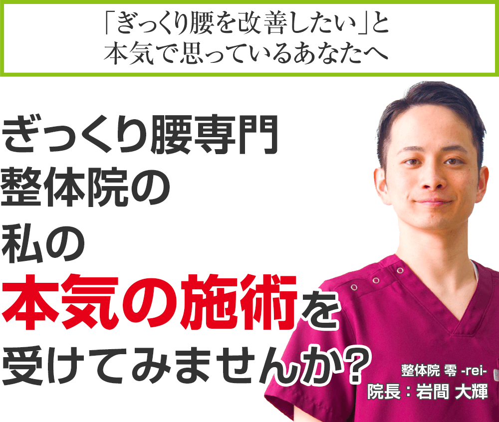 もしあなたが今、上記のようなお悩みを抱え、ほんの少しでも⼼のどこかで良くなりたい!と思われているなら、整体院 零-REI-に来院し、そのつらい慢性ぎっくり腰を根本から改善しませんか?