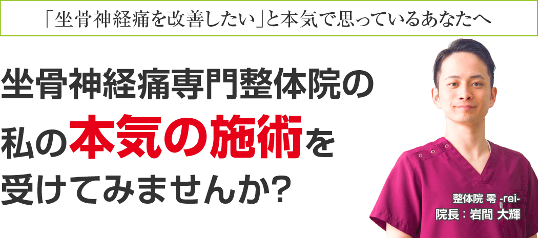 もしあなたが今、上記のようなお悩みを抱え、ほんの少しでも⼼のどこかで良くなりたい!と思われているなら、整体院 零-REI-に来院し、そのつらい慢性坐骨神経痛を根本から改善しませんか?